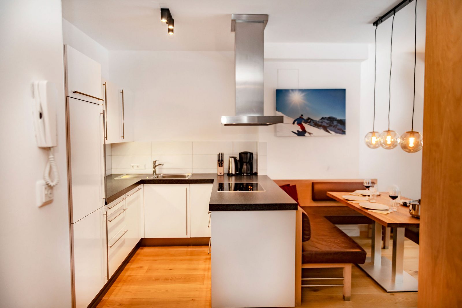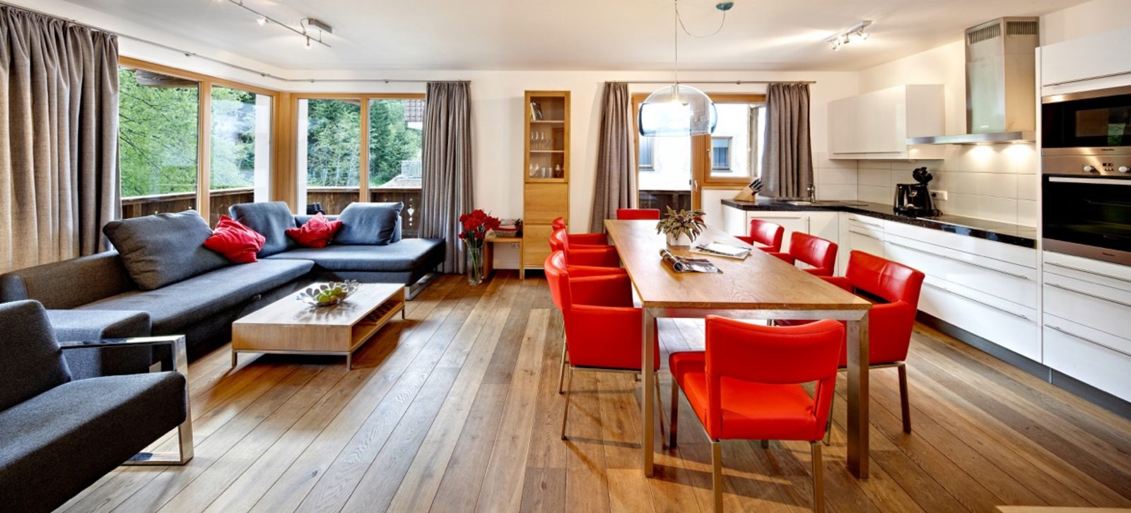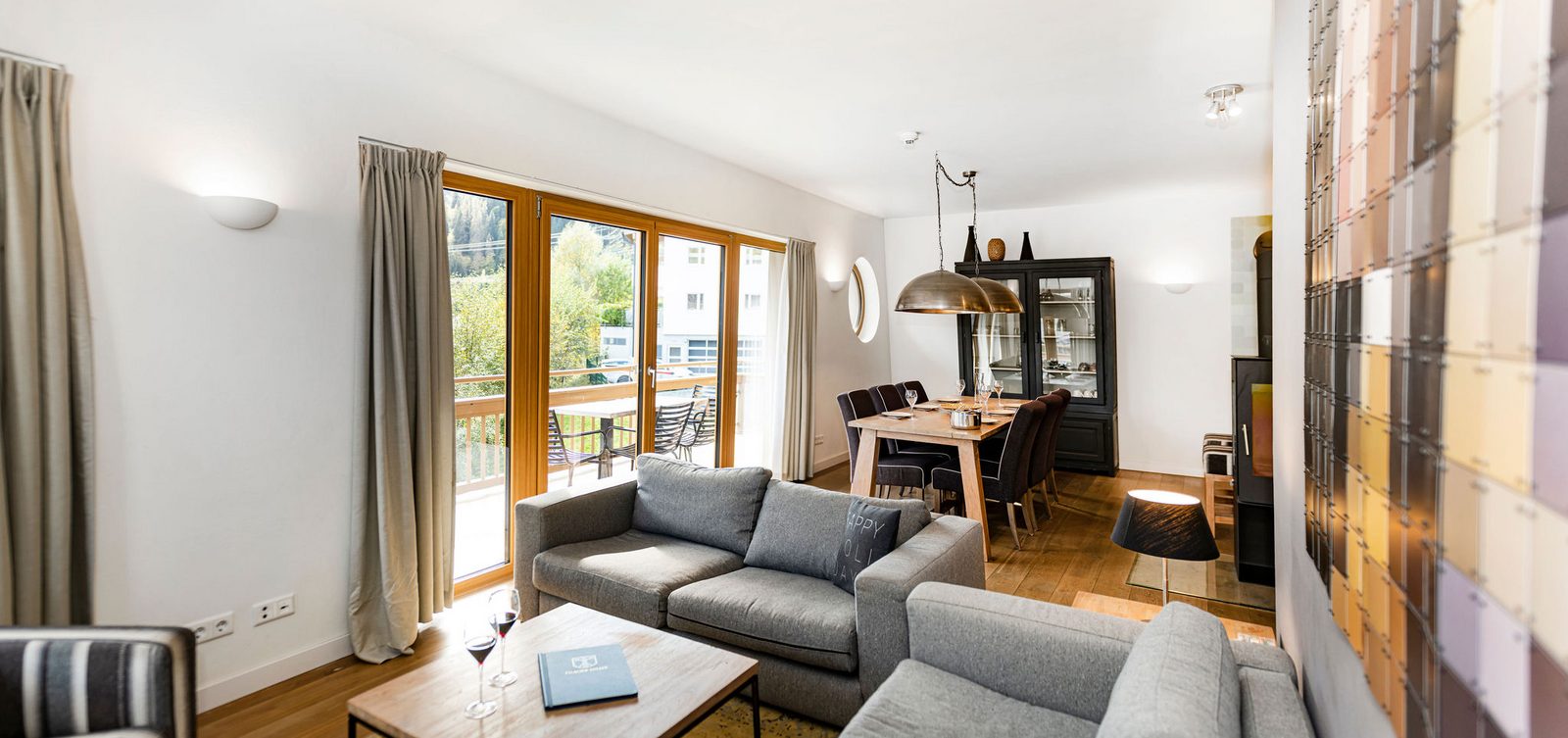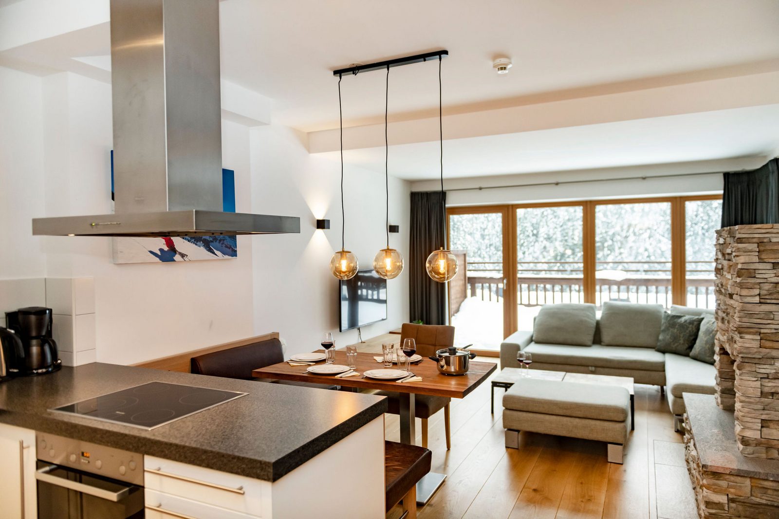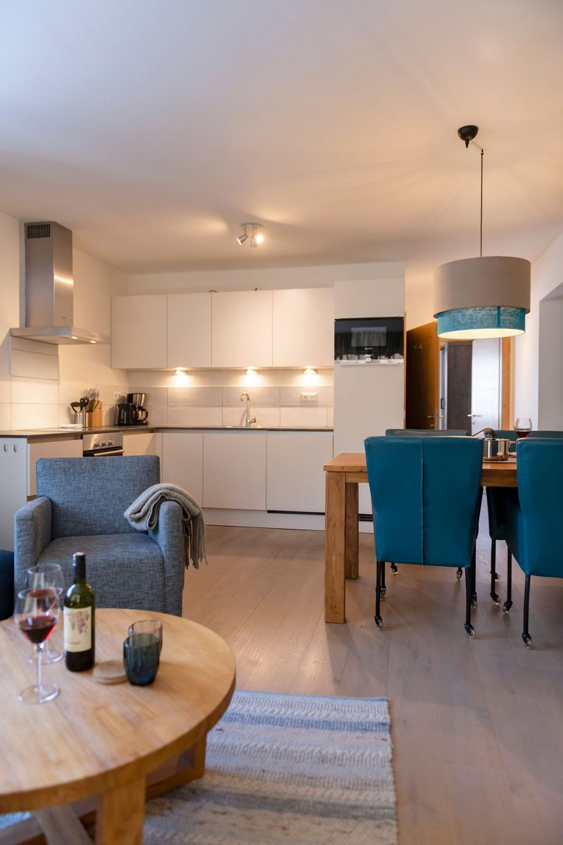 Kristall Plaza Niederau offers 5 stylish apartments for 4 to 10 guests and a luxurious penthouse, each with a terrace or balcony and panoramic mountain views. Located directly opposite the Markbachjoch gondola, the property provides easy access to winter slopes and summer activities, featuring modern interiors, Tieleman design kitchens, and luxurious bathrooms for a comfortable stay all year round.