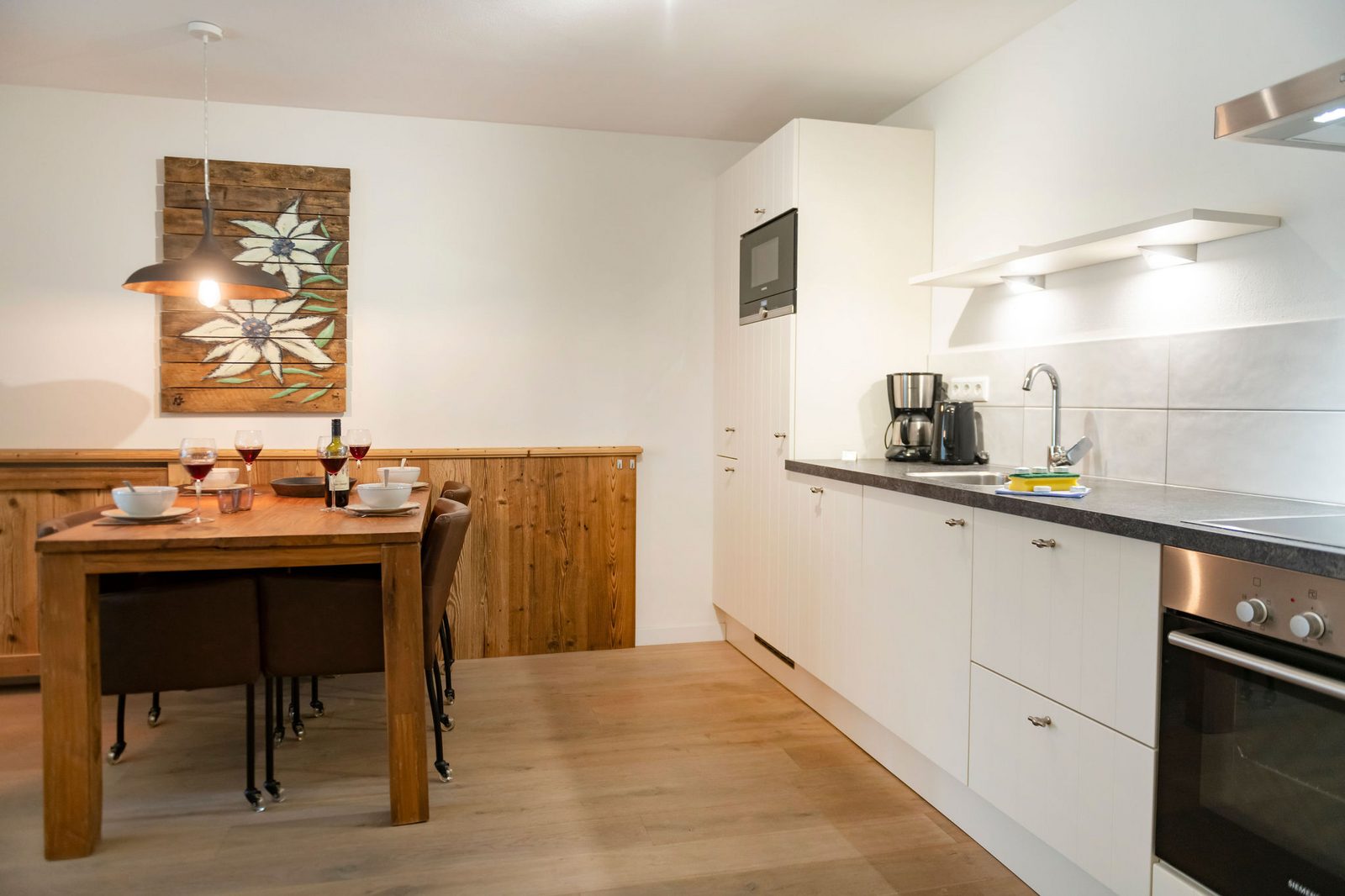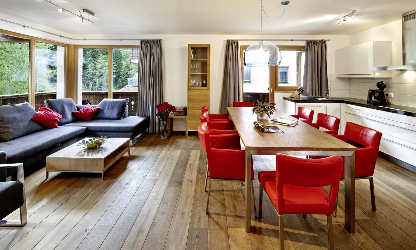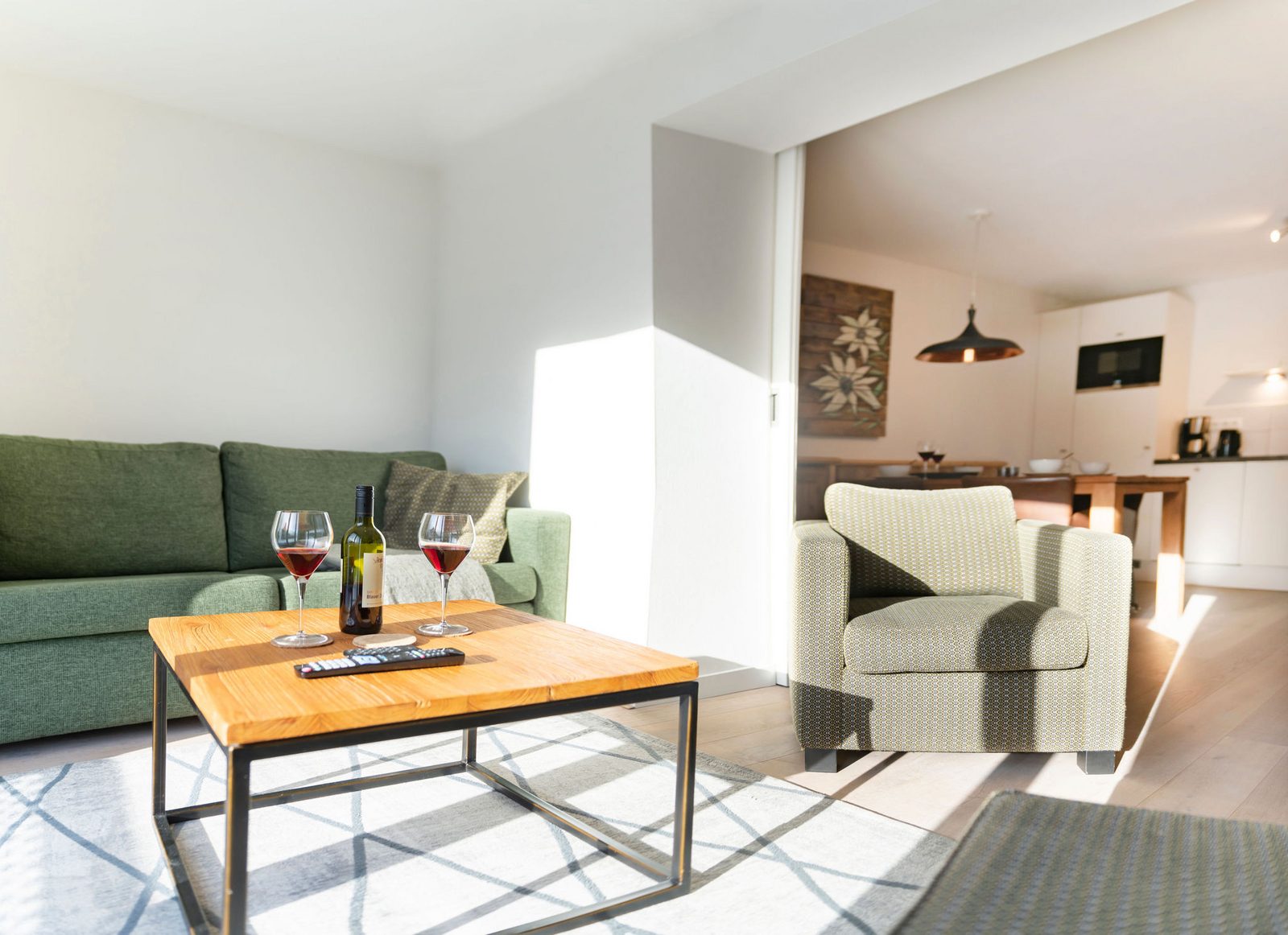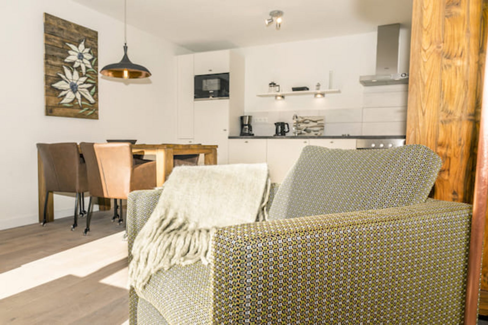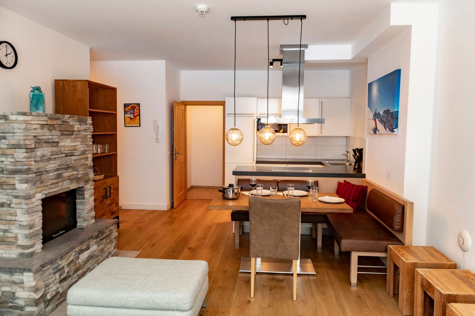 Kristall Plaza Niederau offers 5 stylish apartments for 4 to 10 guests and a luxurious penthouse, each with a terrace or balcony and panoramic mountain views. Located directly opposite the Markbachjoch gondola, the property provides easy access to winter slopes and summer activities, featuring modern interiors, Tieleman design kitchens, and luxurious bathrooms for a comfortable stay all year round.