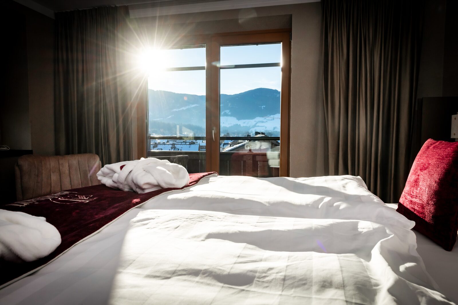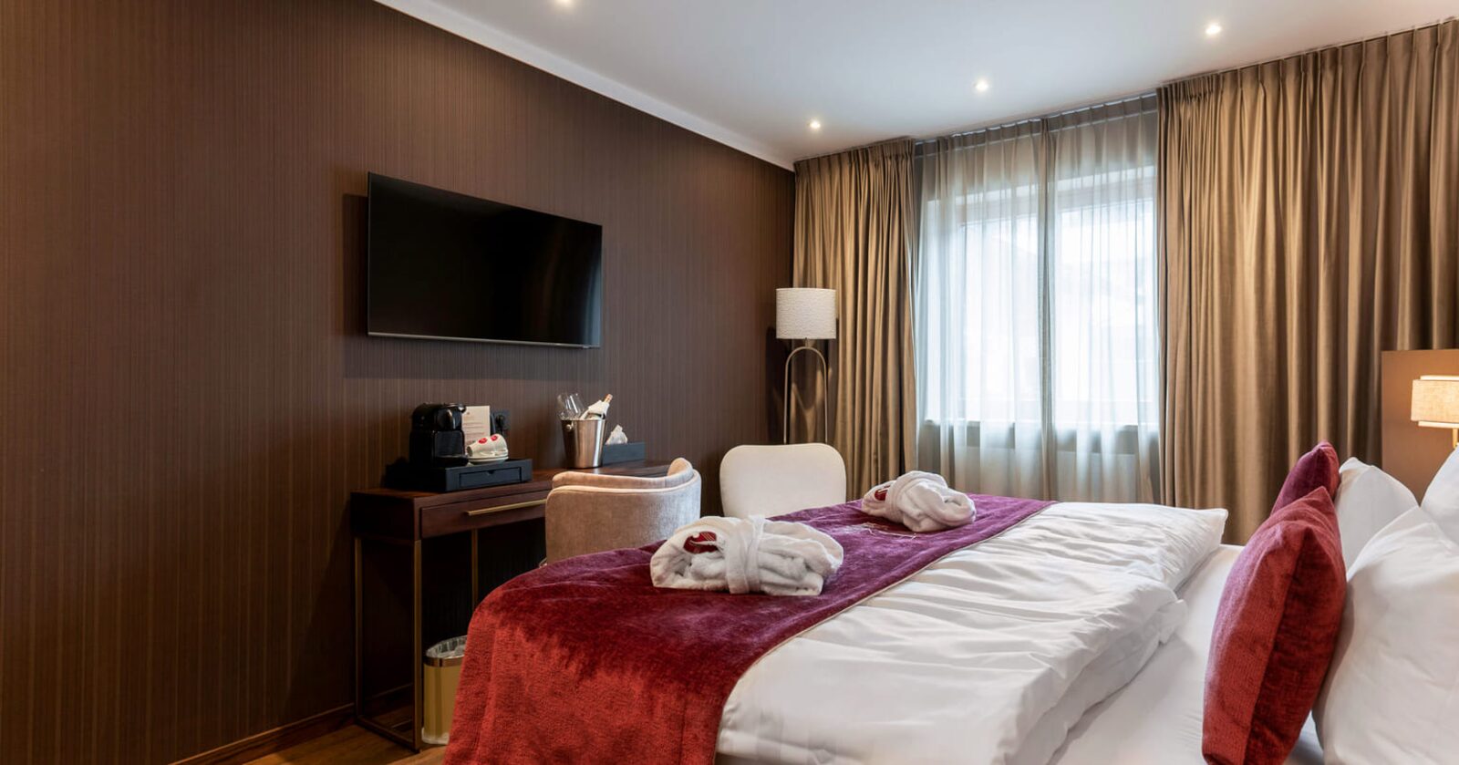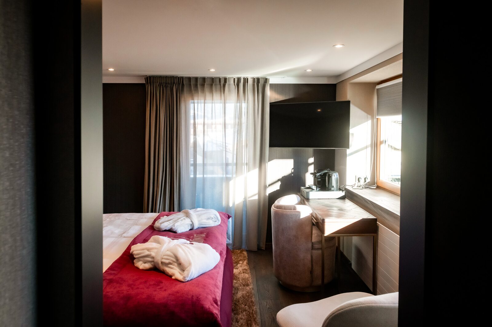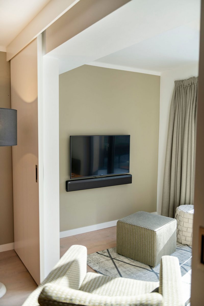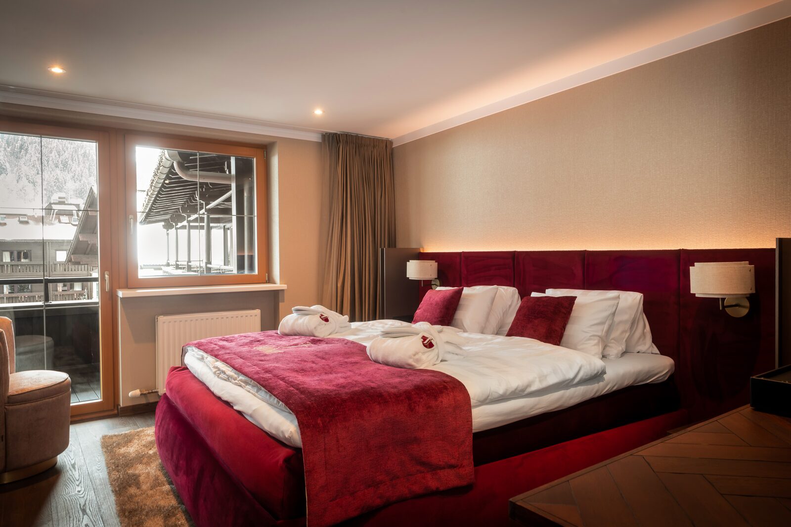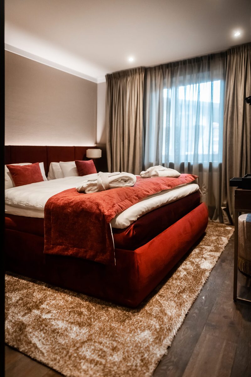 The hotel features modern rooms and luxury suites with king-size beds, smart TVs, Nespresso machines, and spacious bathrooms with walk-in showers. Guests can securely store their ski or cycling equipment in the dedicated storage room and enjoy a central location for both winter slopes and summer outdoor activities. The hotel is adults-only (15+).