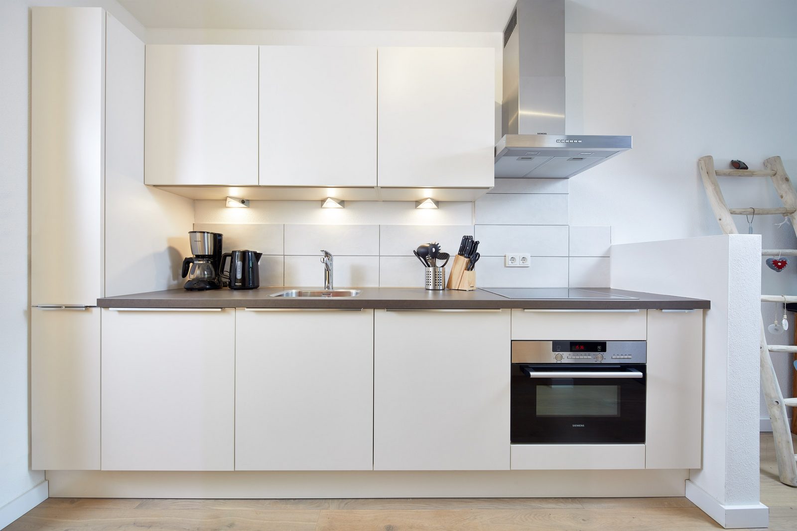 The kitchen is equipped with brand-name appliances and includes a cooktop, refrigerator, dishwasher, microwave, oven, filter coffee maker, kettle, and toaster.