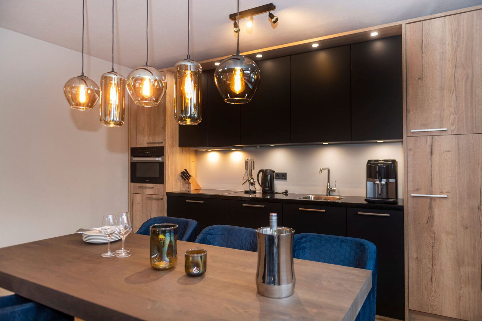 The kitchen is equipped with brand-name appliances, including a cooktop, refrigerator/freezer combination, dishwasher, microwave, oven, coffee machine (bean-to-cup), kettle, and toaster.